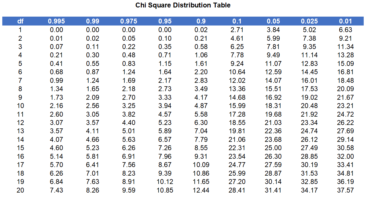 After calculating \(\chi^2\) the degrees of freedom, df, is needed to check the critical value on a look-up table. This is given by: